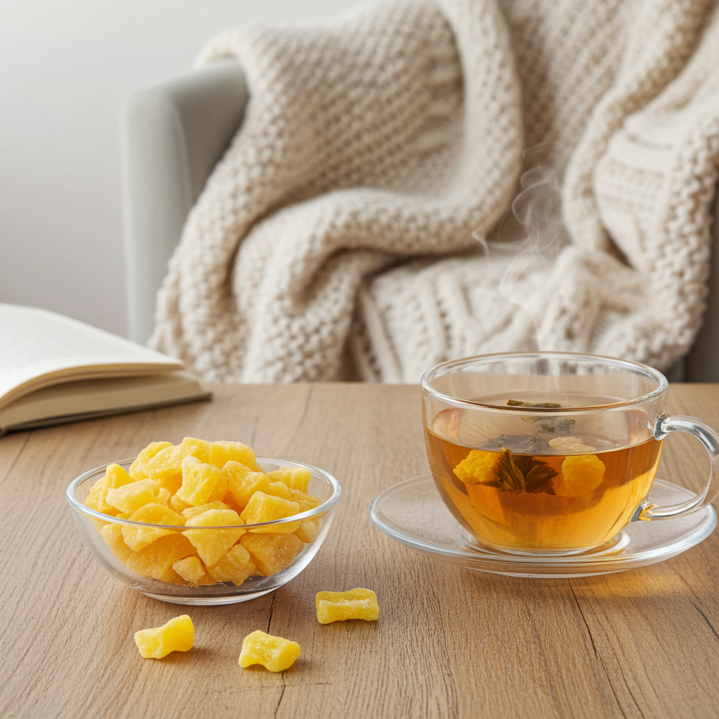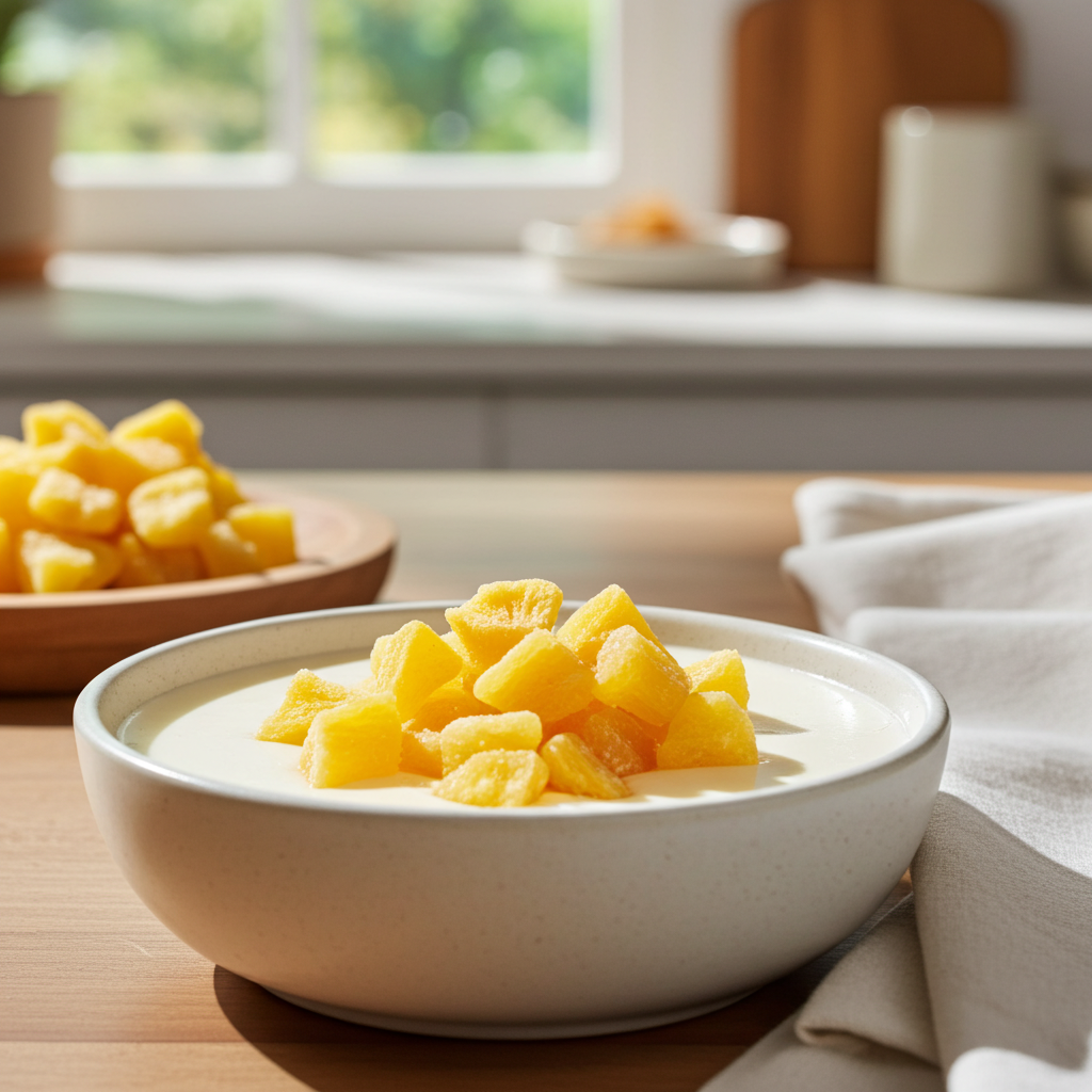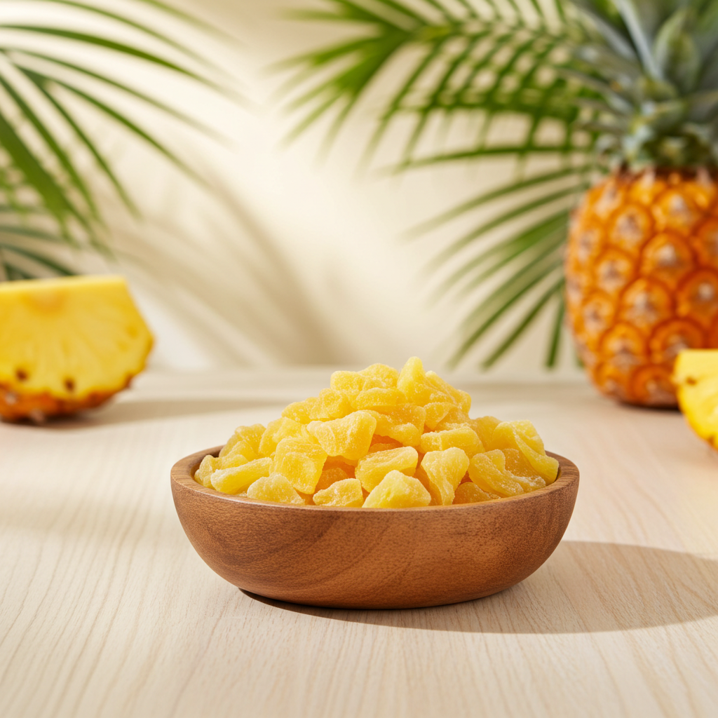 Getrocknete Ananas eignet sich hervorragend zum puren Naschen, ist aber auch eine köstliche Zutat beispielsweise zum morgendlichen Müsli oder für exotische Gerichte. Unsere Ananasscheiben und Ananasstücke geben asiatischen Speisen ein herrlich fruchtiges, fein säuerliches Aroma.
