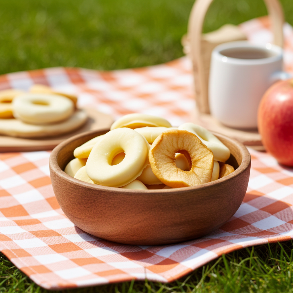 Beschreibung: getrocknete, geschwefelte Apfelringe mit zartschmelzender