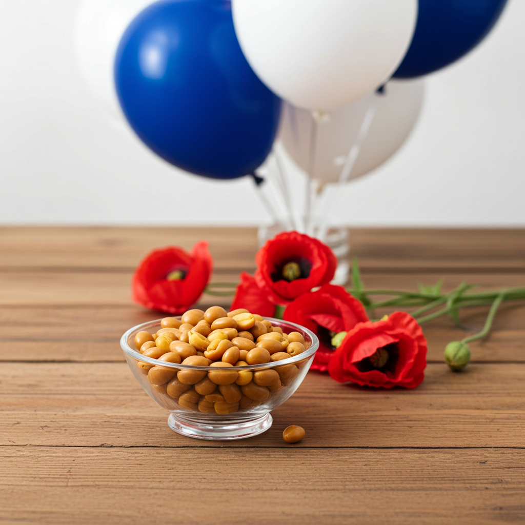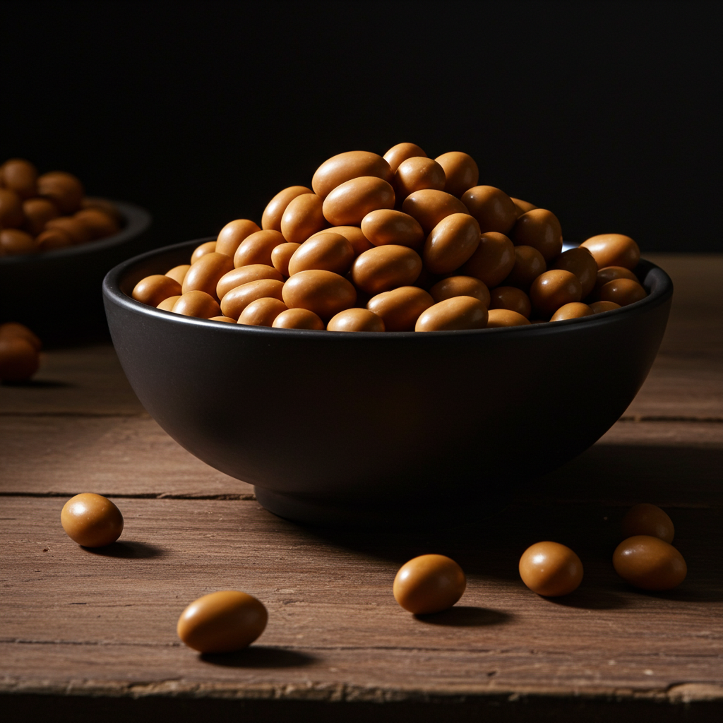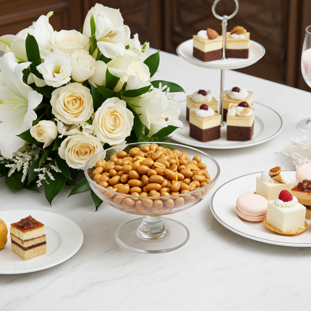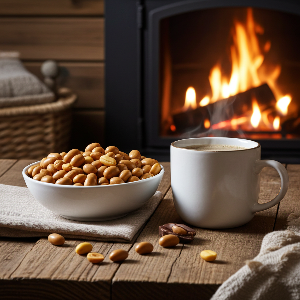 Beschreibung: Erdnusskerne umhüllt mit weißer Schokolade und Kakaomasse