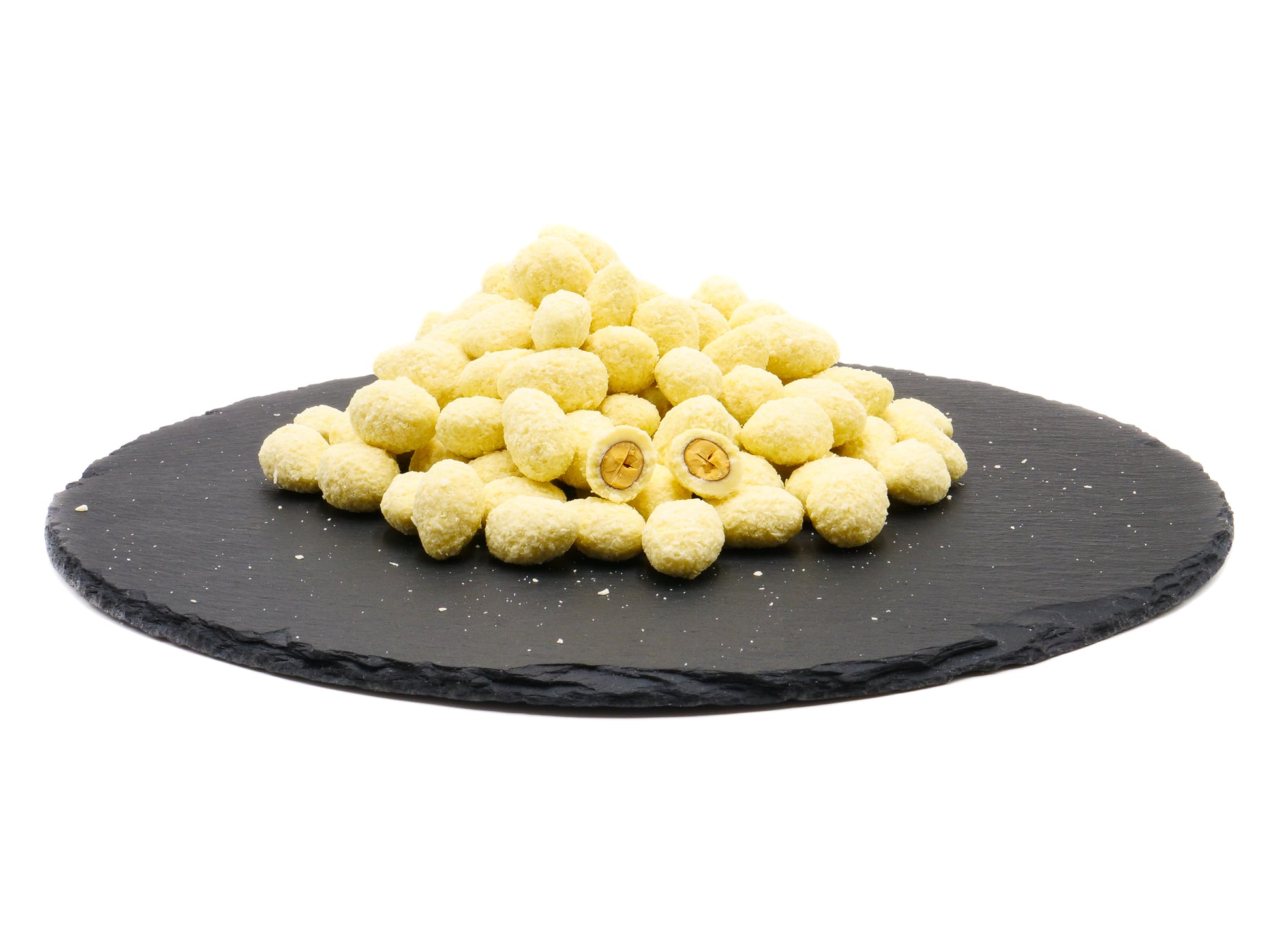 Beschreibung: Mandeln in weißer Schokolade mit Kokosflocken